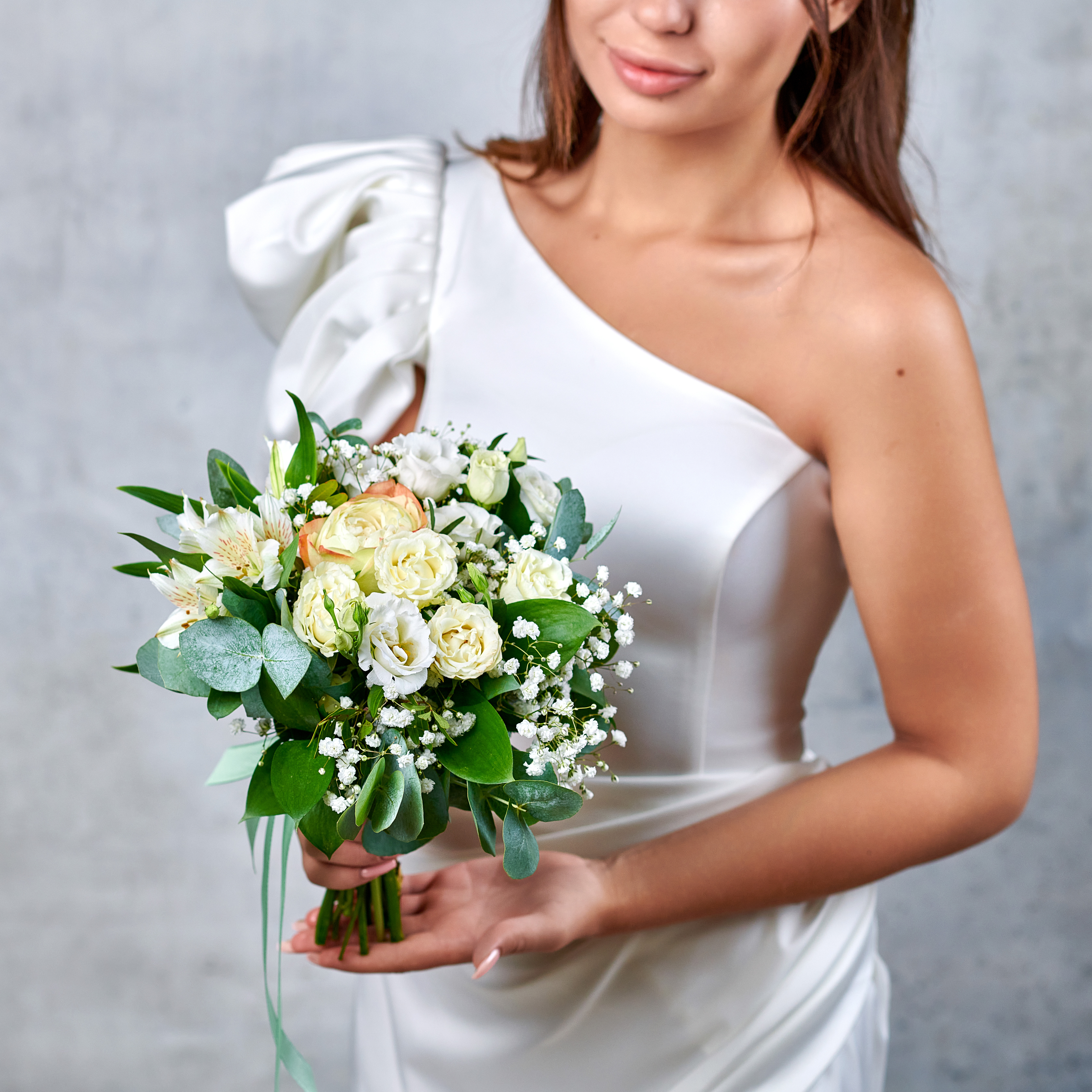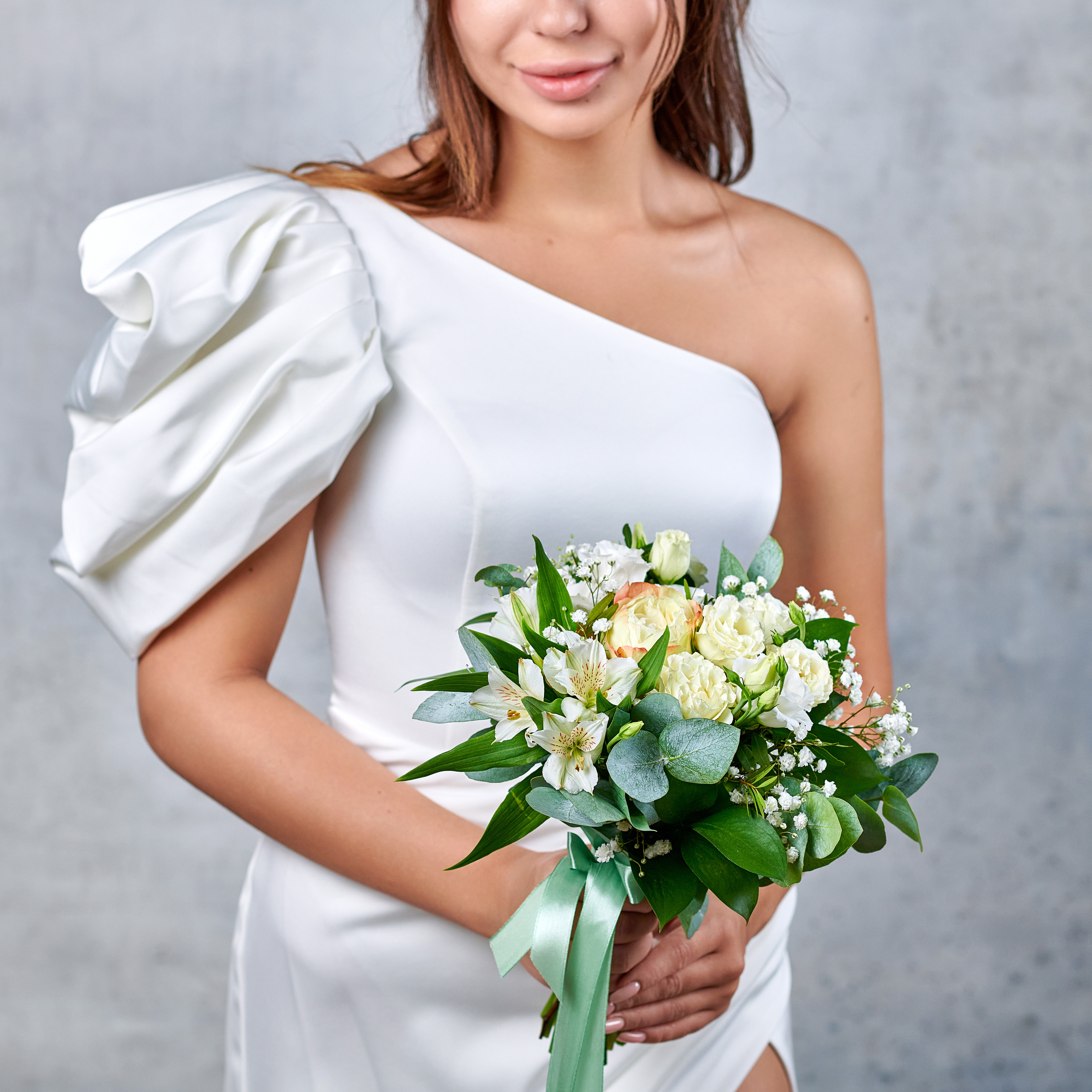 Нежные белые оттенки, благородная зелень - идеальны для торжественных моментов. Возможны небольшие изменения элементов. Общий вид и композиция букета будет сохранена.