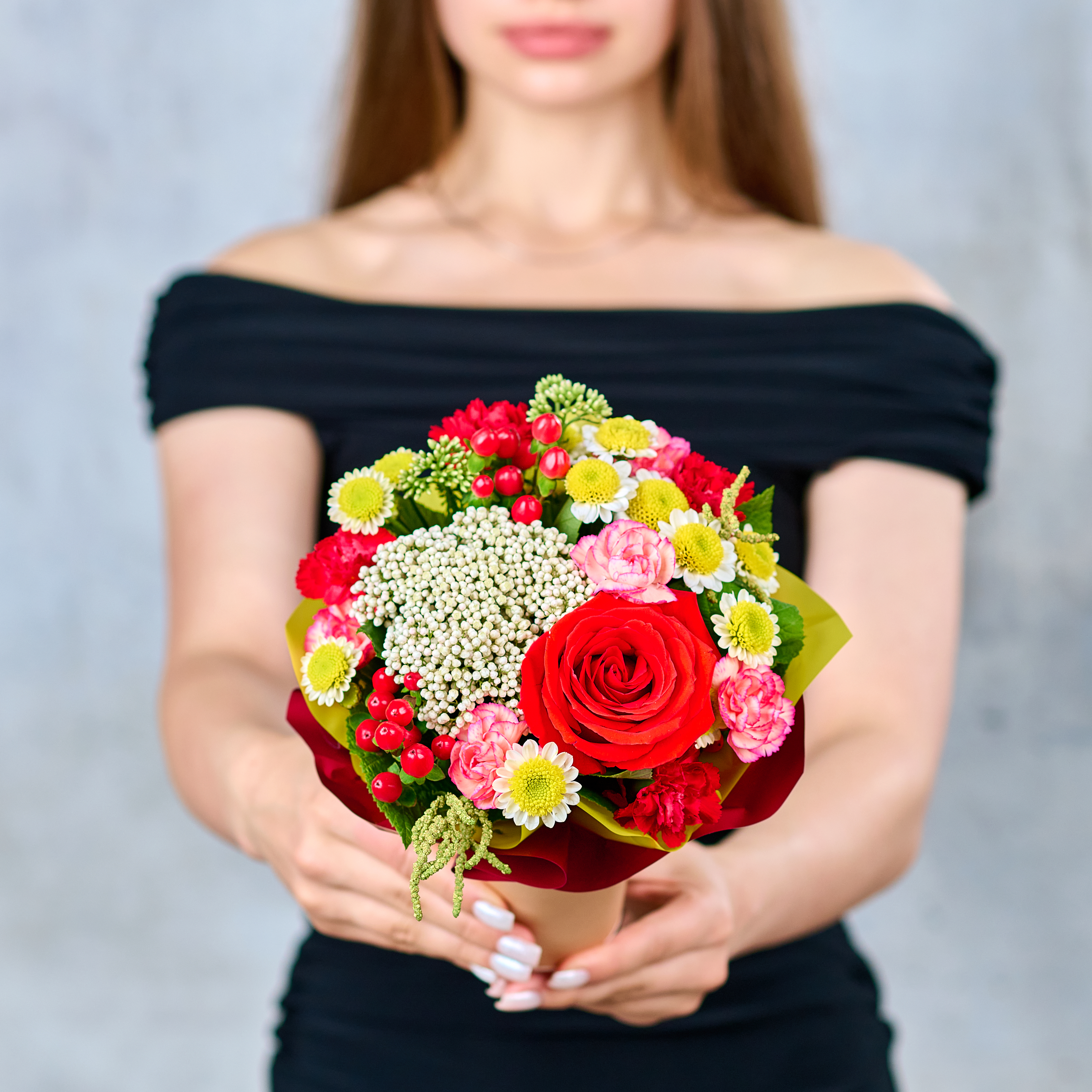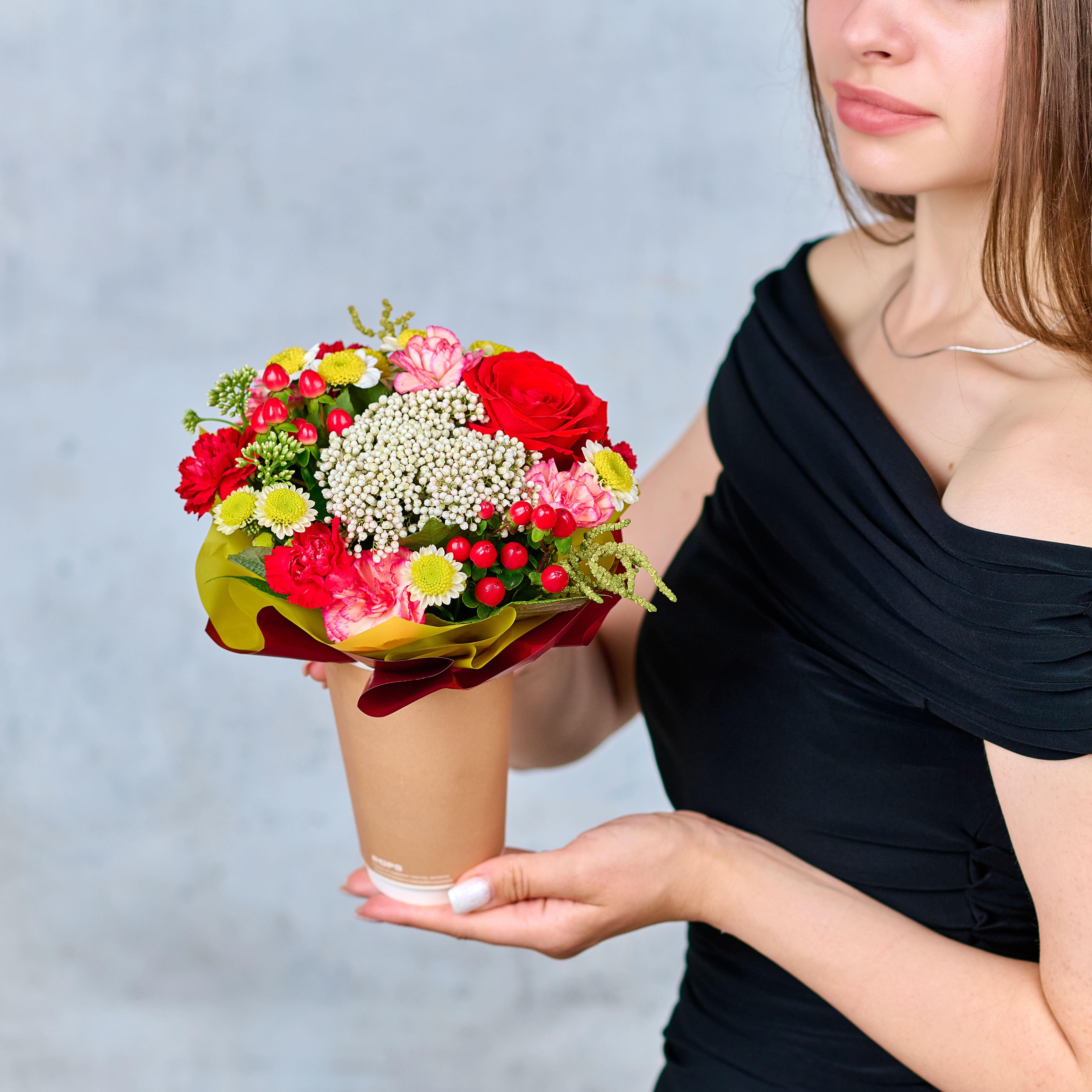 Яркий цветочный комплимент в кофейном стакане, который поднимет натсроение и напомнит о самом важном. Возможны небольшие изменения элементов. Общий вид и композиция букета будет сохранена.