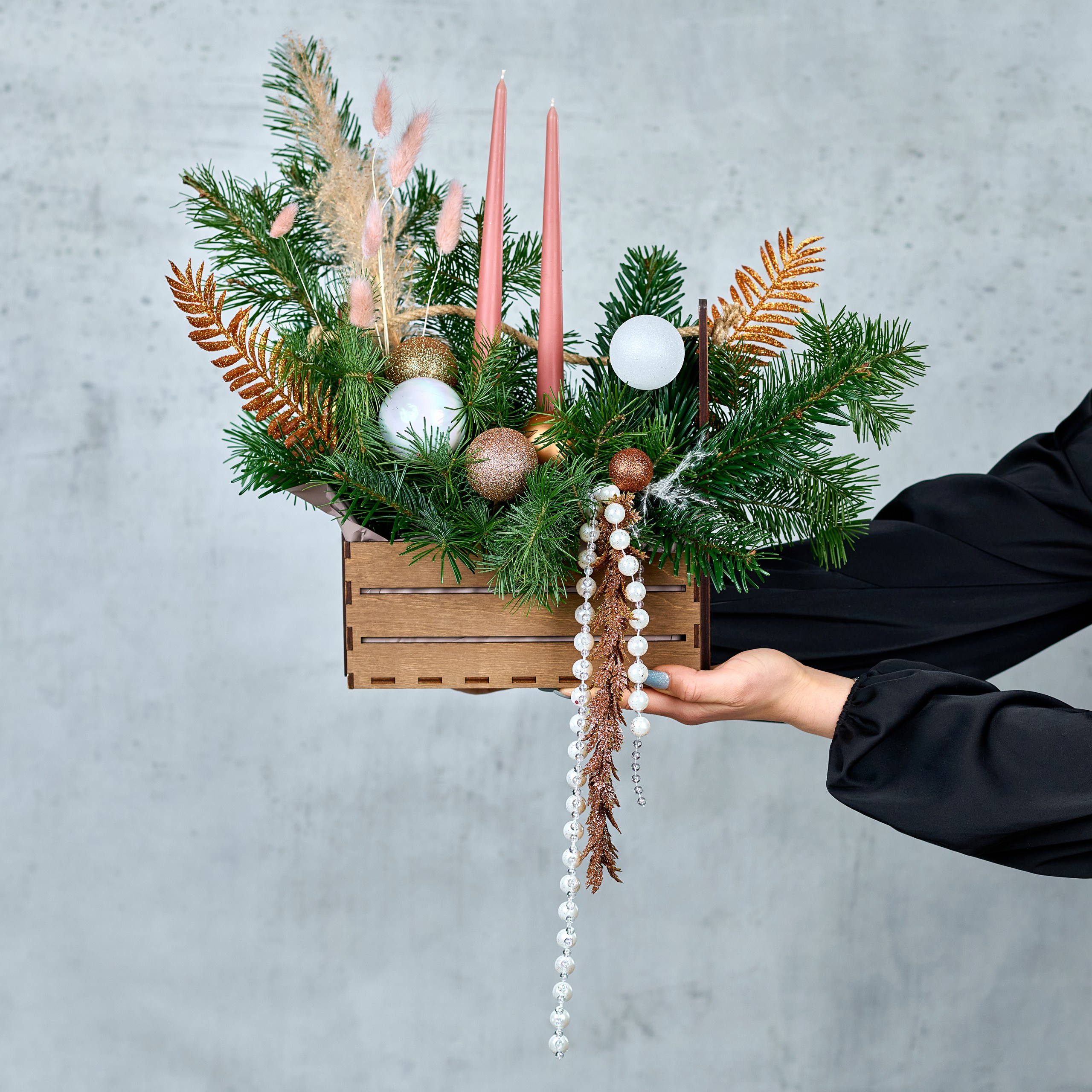 Праздничная композиция в стильном ящике: пушистая ель, свечи, лагурус и кортадерия, украшенные шарами, бусами и декоративными ветками. Идеальный акцент для зимнего интерьера. Общий вид и композиция букета будет сохранена.