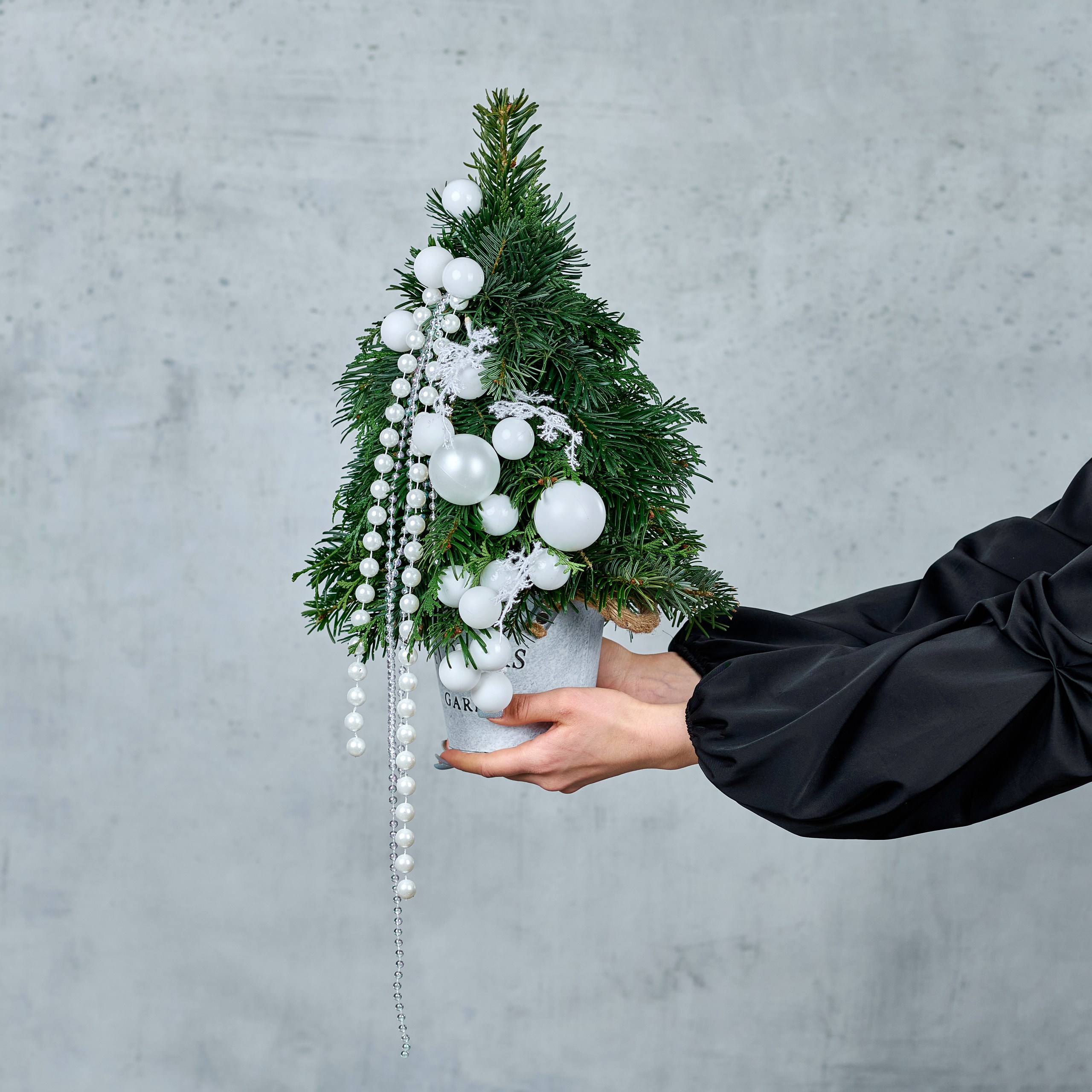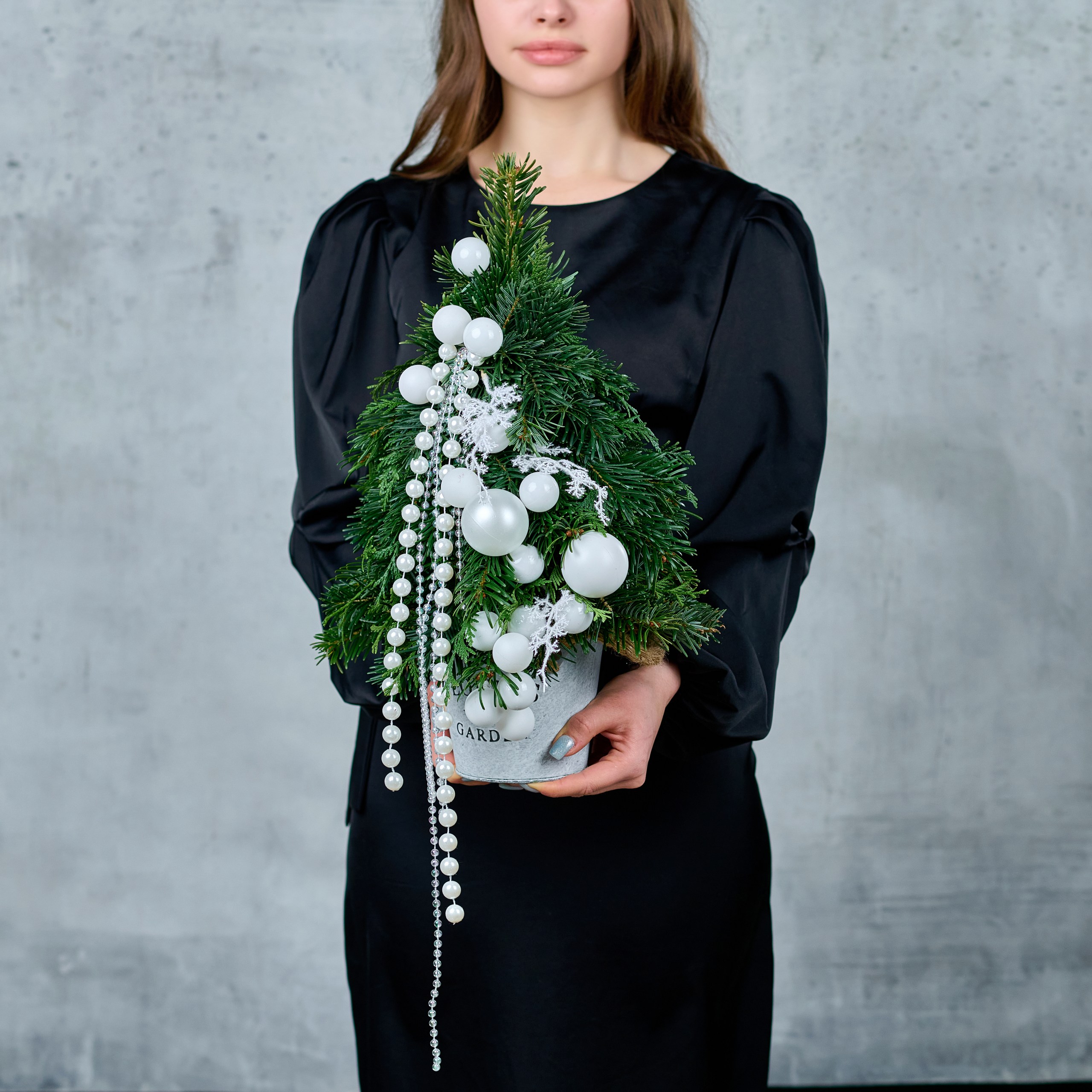 Роскошная новогодняя композиция в металлическом кашпо: пушистая ель и жемчужные бусы. Завершенный образ праздника и уюта для вашего интерьера! Общий вид и композиция букета будет сохранена.