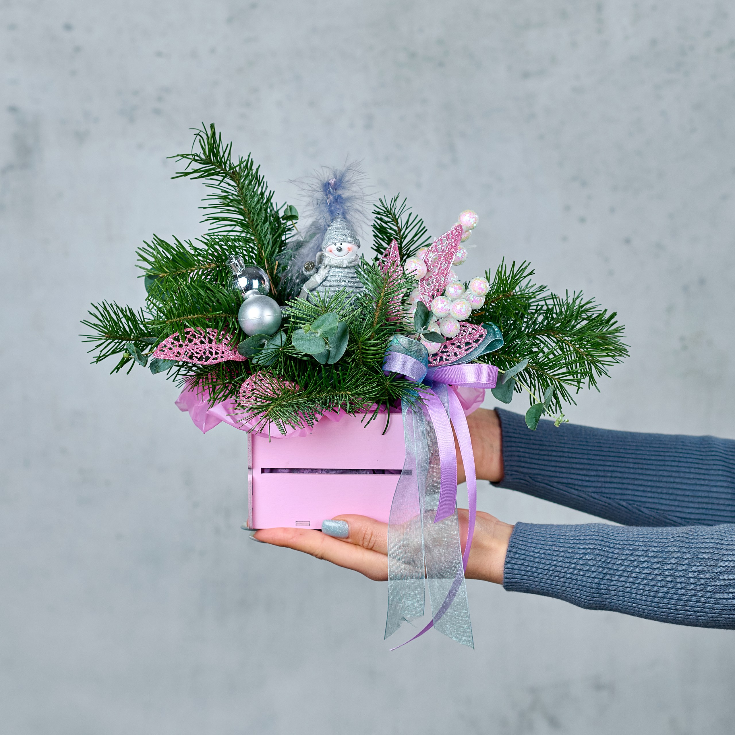 Новогодняя композиция в деревянном ящике с эвкалиптом и елью. Возможны небольшие изменения элементов. Общий вид и композиция букета будет сохранена.