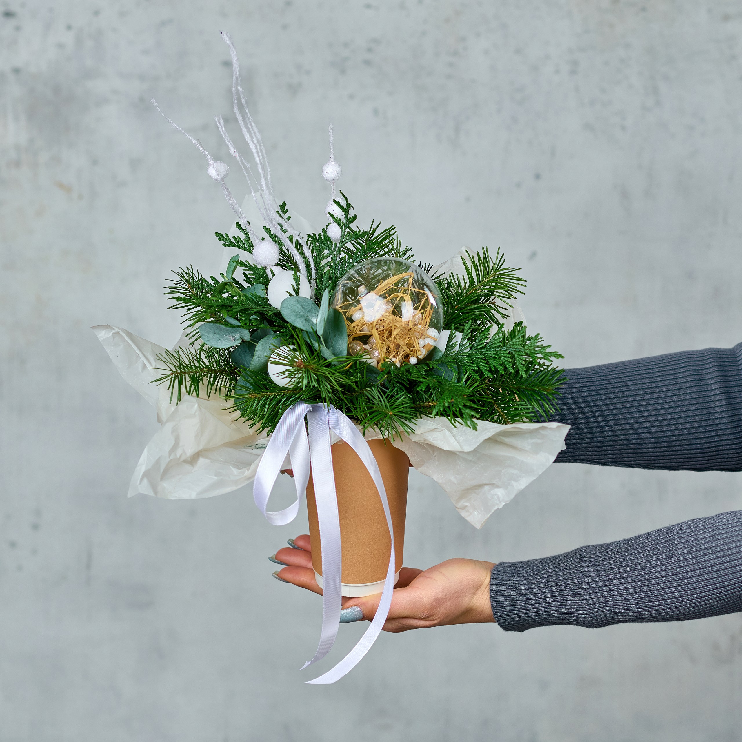 Яркая новогодняя композиция в кофейном стакане, украсит ваш праздник. Возможны небольшие изменения элементов. Общий вид и композиция букета будет сохранена.