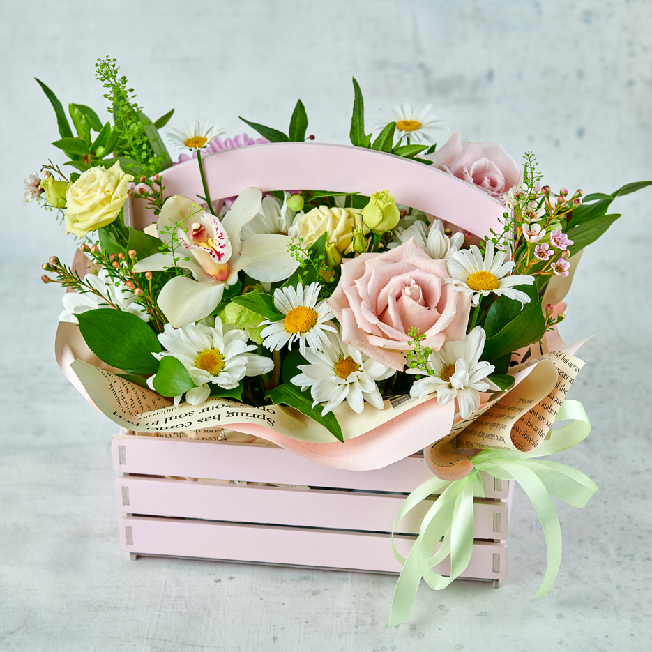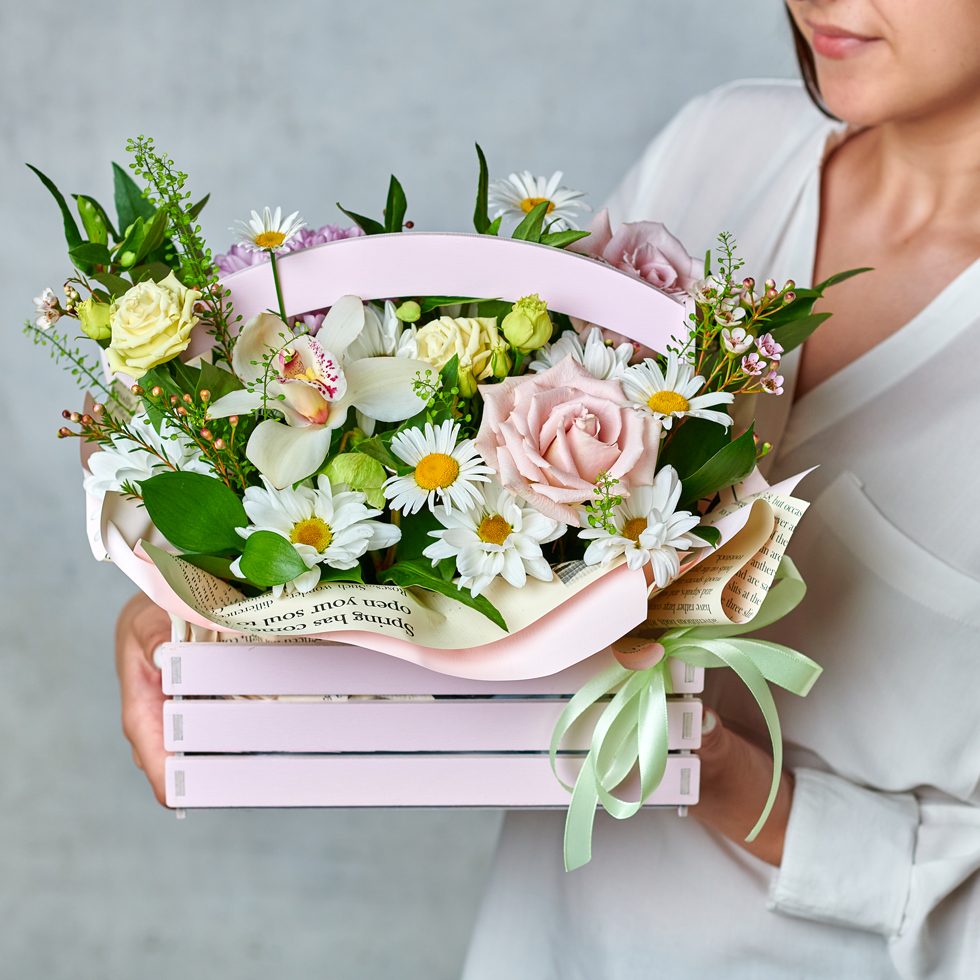 Воздушный поцелуй теплого утра, нежная орхидея, трогательные ромашки и море волшебных эмоций. Возможны небольшие изменения элементов. Общий вид и композиция букета будет сохранена.