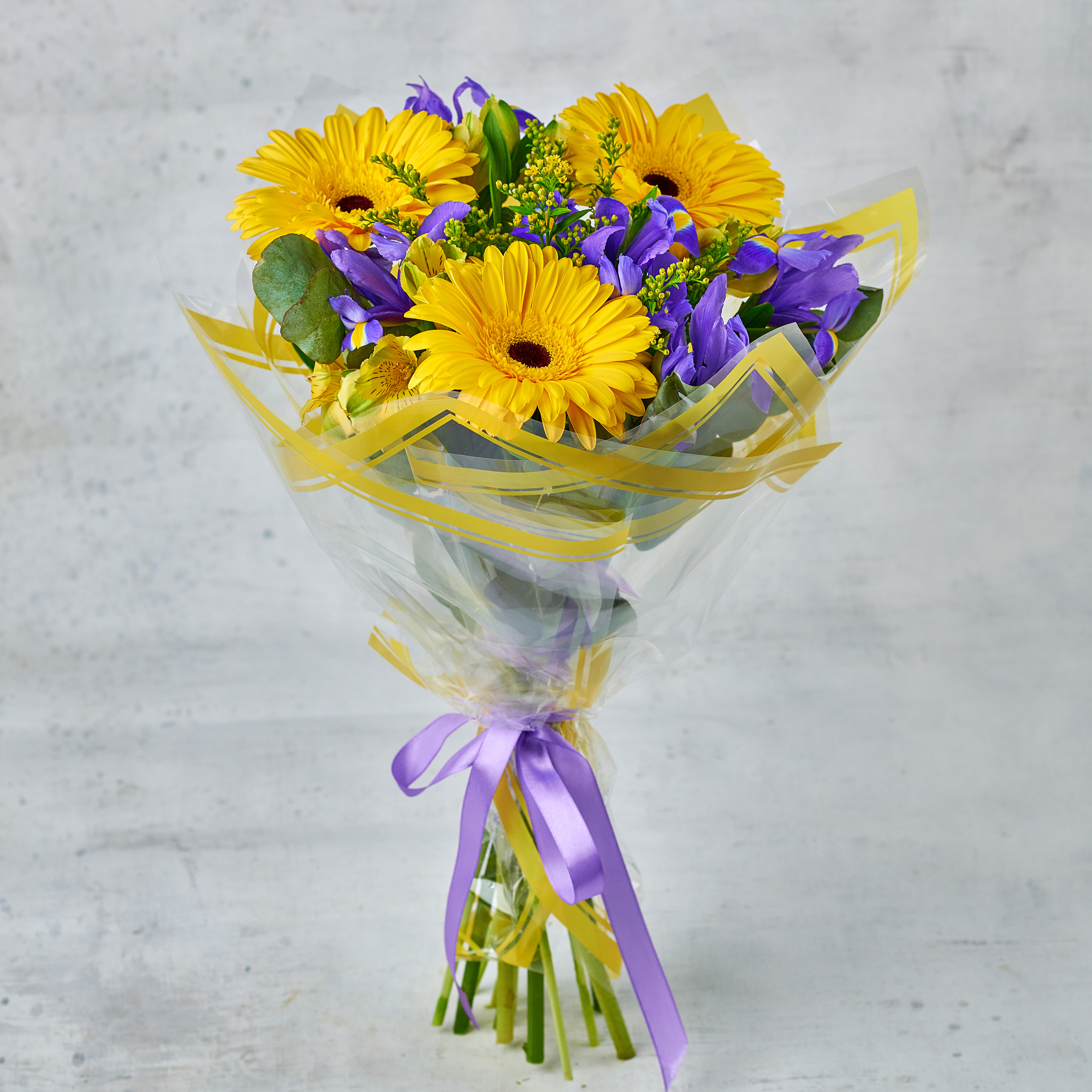 Солнце, пойманное в синие волны ирисовых полей - настоящий хит. Стойкий состав, радостные оттенки и счастье на лице ваших любимых - идеальное решение для цветочного подарка.Возможны небольшие изменения элементов. Общий вид и композиция букета будет сохранена.
