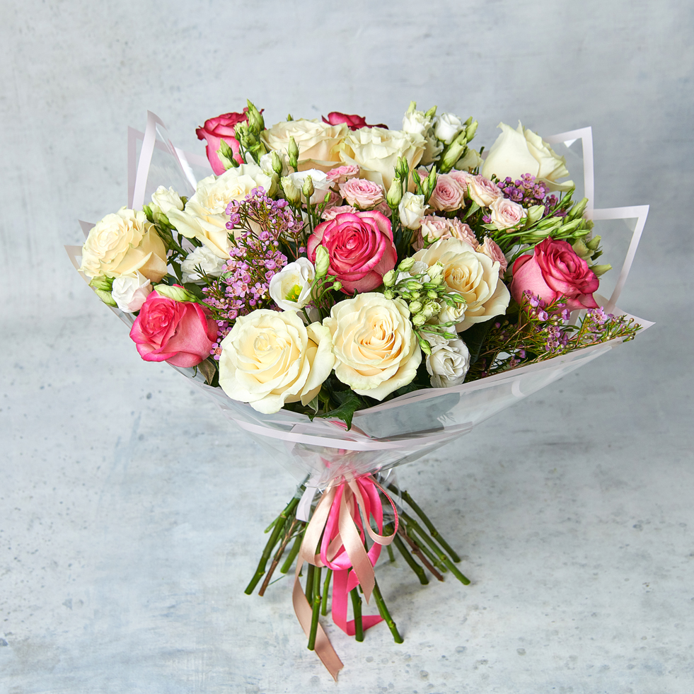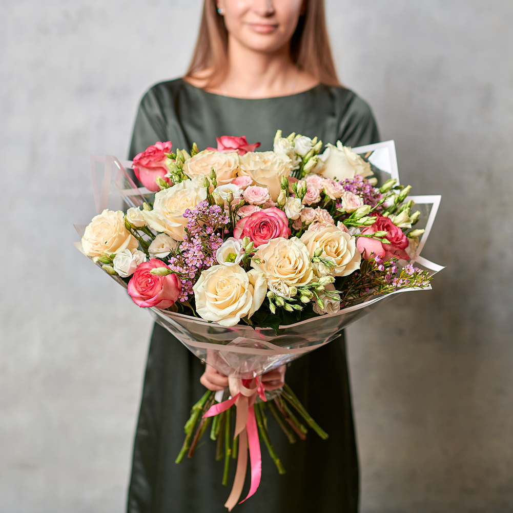 Эффектный объемный букет из микса роз. Такому подарку точно будет рада каждая, ведь он собрал в себе все самые красивые оттенки. Букет, который хочется вдыхать и рассматривать каждую деталь. Возможны небольшие изменения элементов. Общий вид и композиция букета будет сохранена.