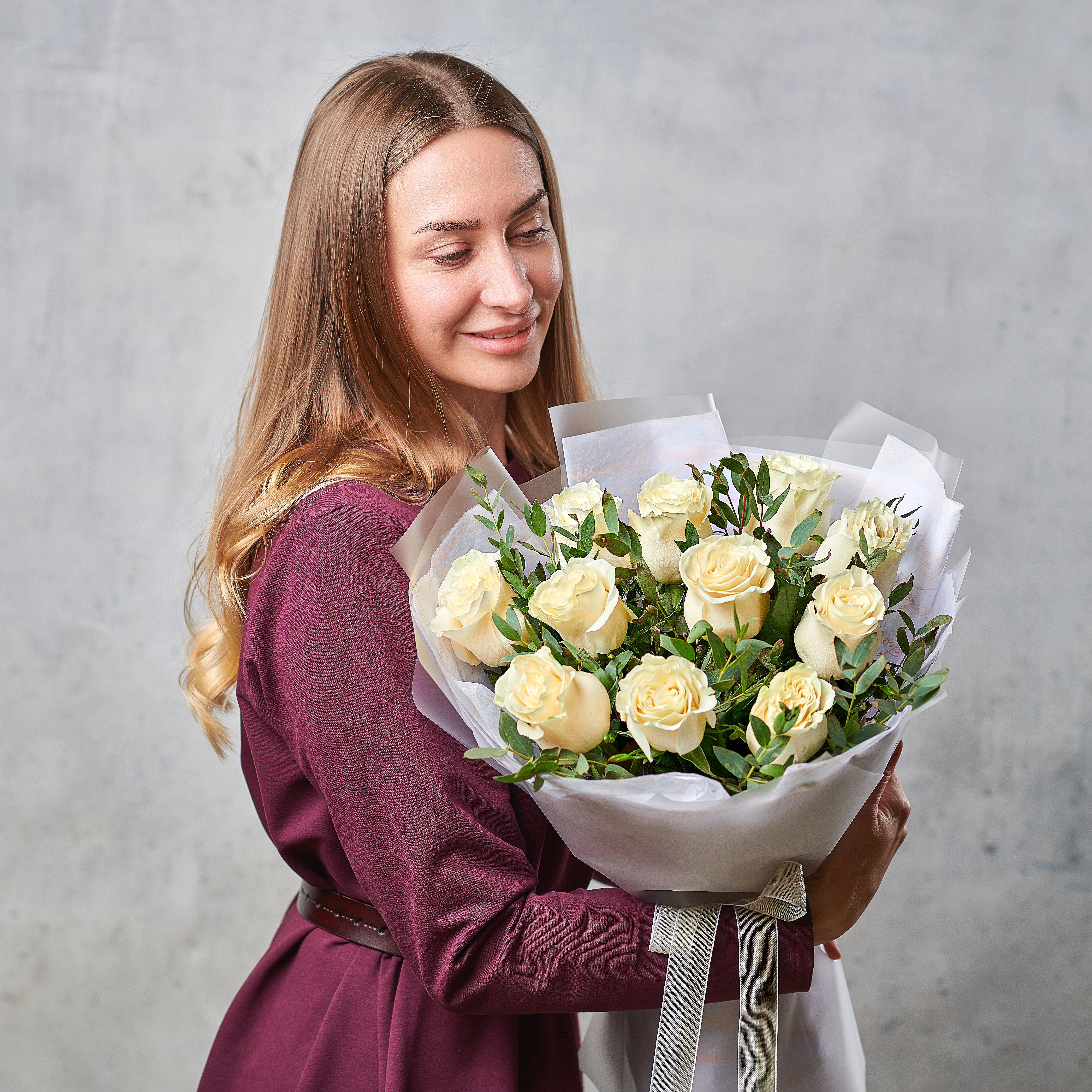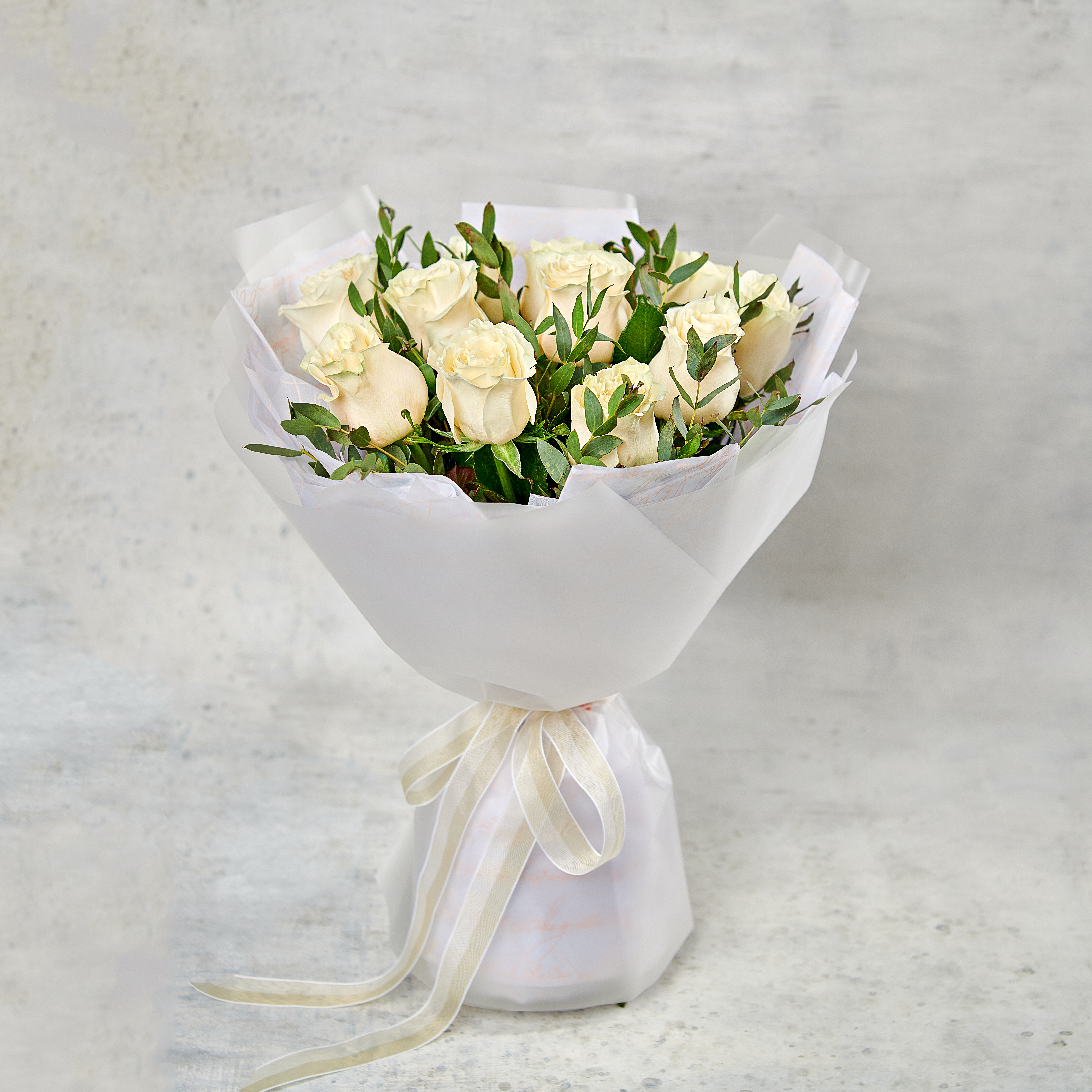 Букет, обладающий сапфировым блеском, станет идеальным подарком для любого повода и возраста. Классическое сочетание прекрасных белых стойких роз с благородной зеленью, обрамленные изящной упаковкой.Возможны небольшие изменения элементов. Общий вид и композиция букета будет сохранена.