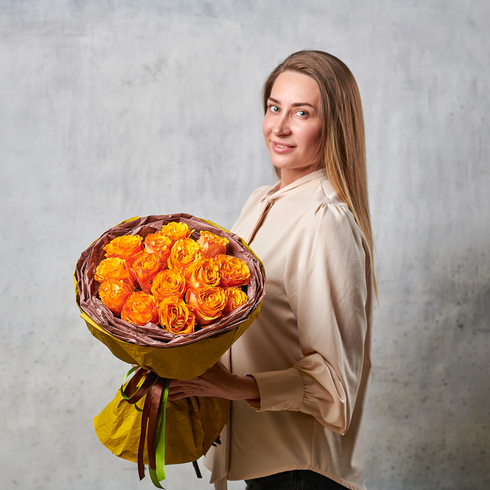 Оранжевые цветы символизируют успех, творчество и счастье. Букет оранжевых роз станет отличным подарком любимым, коллегам или друзьям. Круглая упаковка подчеркнет форму каждого бутона. Возможны небольшие изменения элементов. Общий вид и композиция букета будет сохранена.