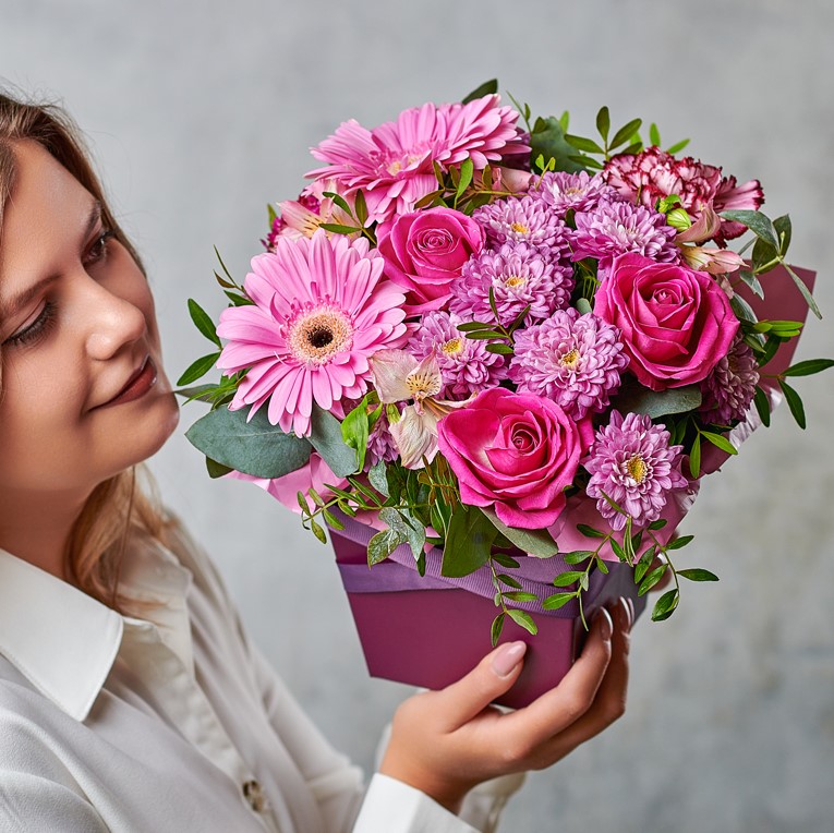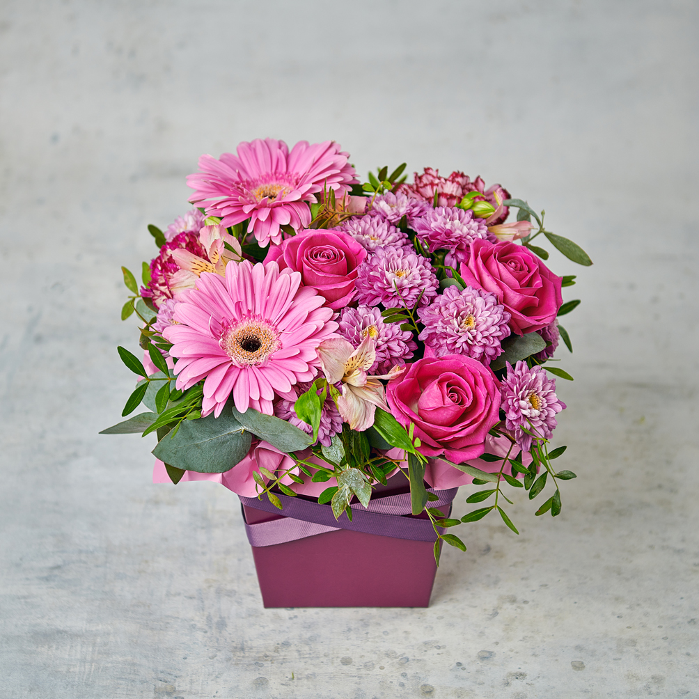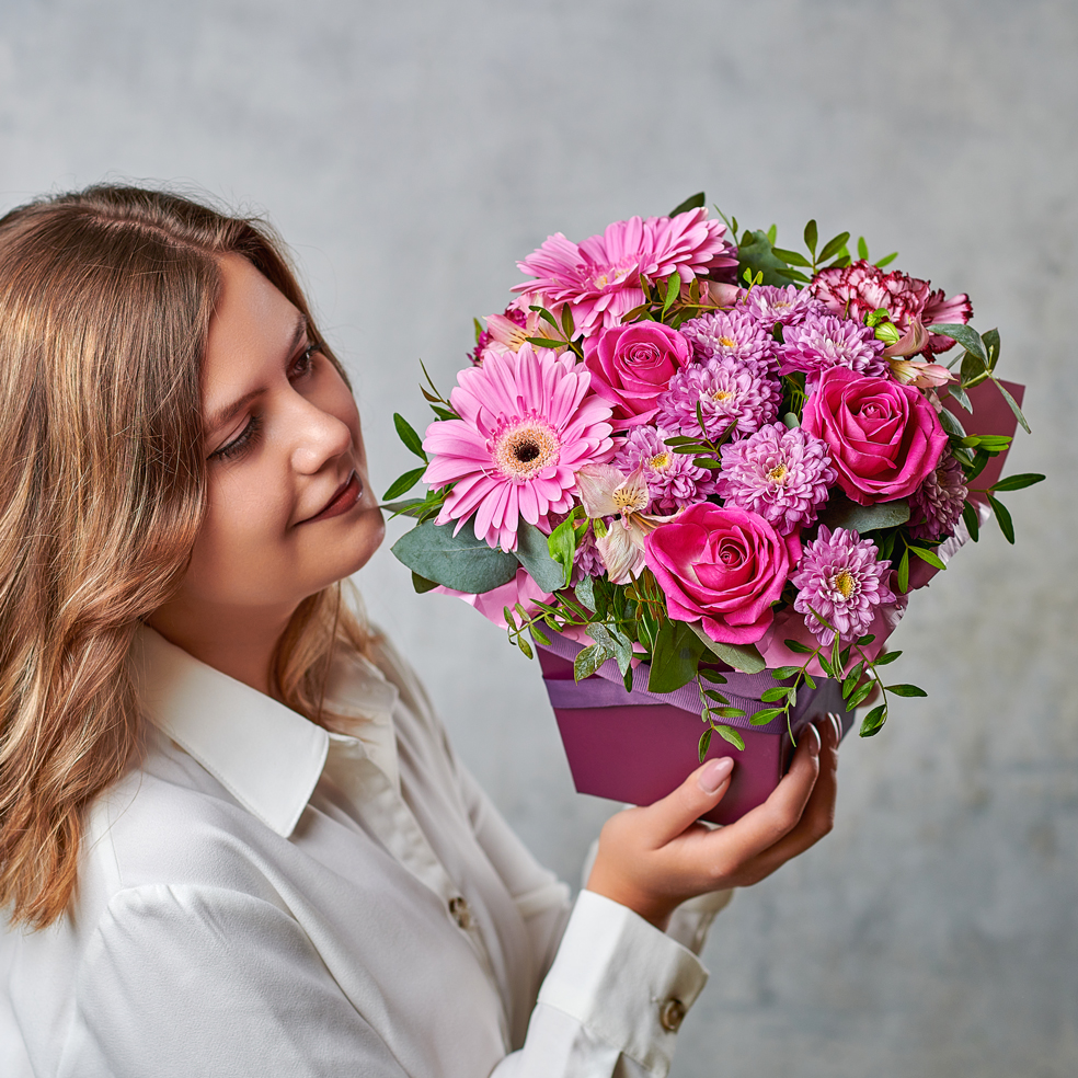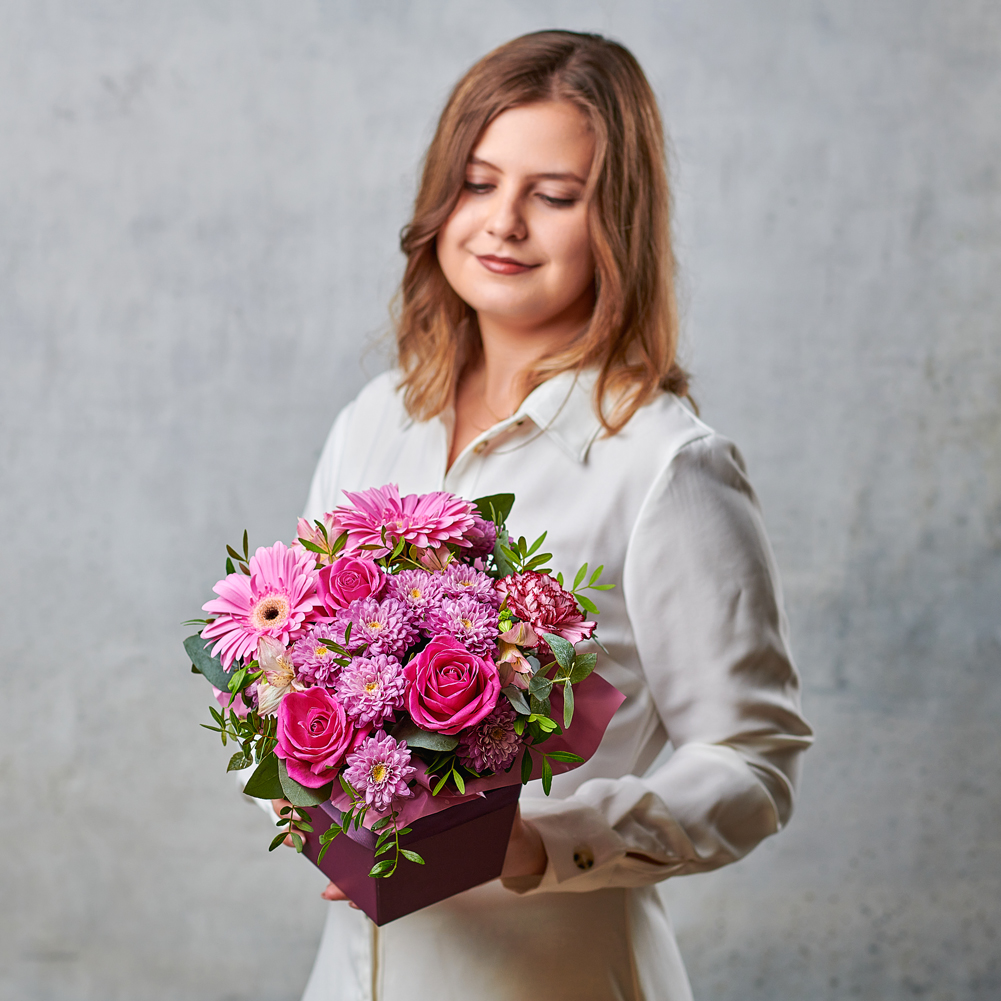 Композиция из лиловых цветочных переливов - то, что нужно, чтобы напомнить о счастливых мгновениях рядом с близкими. Возможны небольшие изменения элементов. Общий вид и композиция букета будет сохранена.