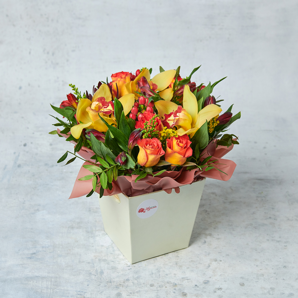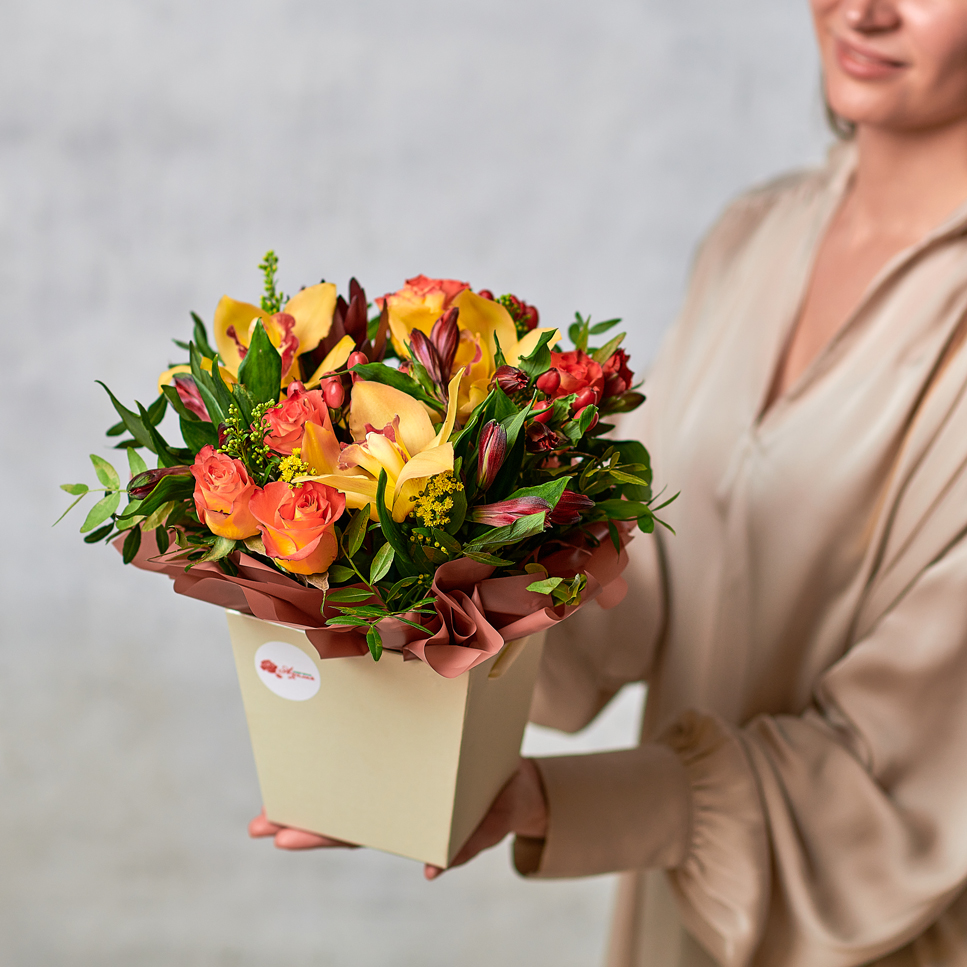 Тропические орхидеи в золотых лепестках - словно осенний туман в нарядном лесу. Возможны небольшие изменения элементов. Общий вид и композиция букета будет сохранена.