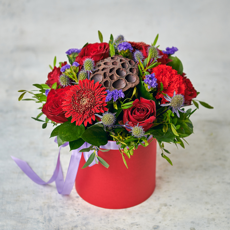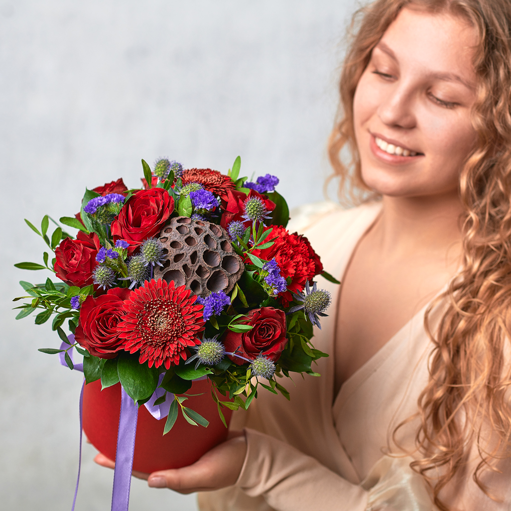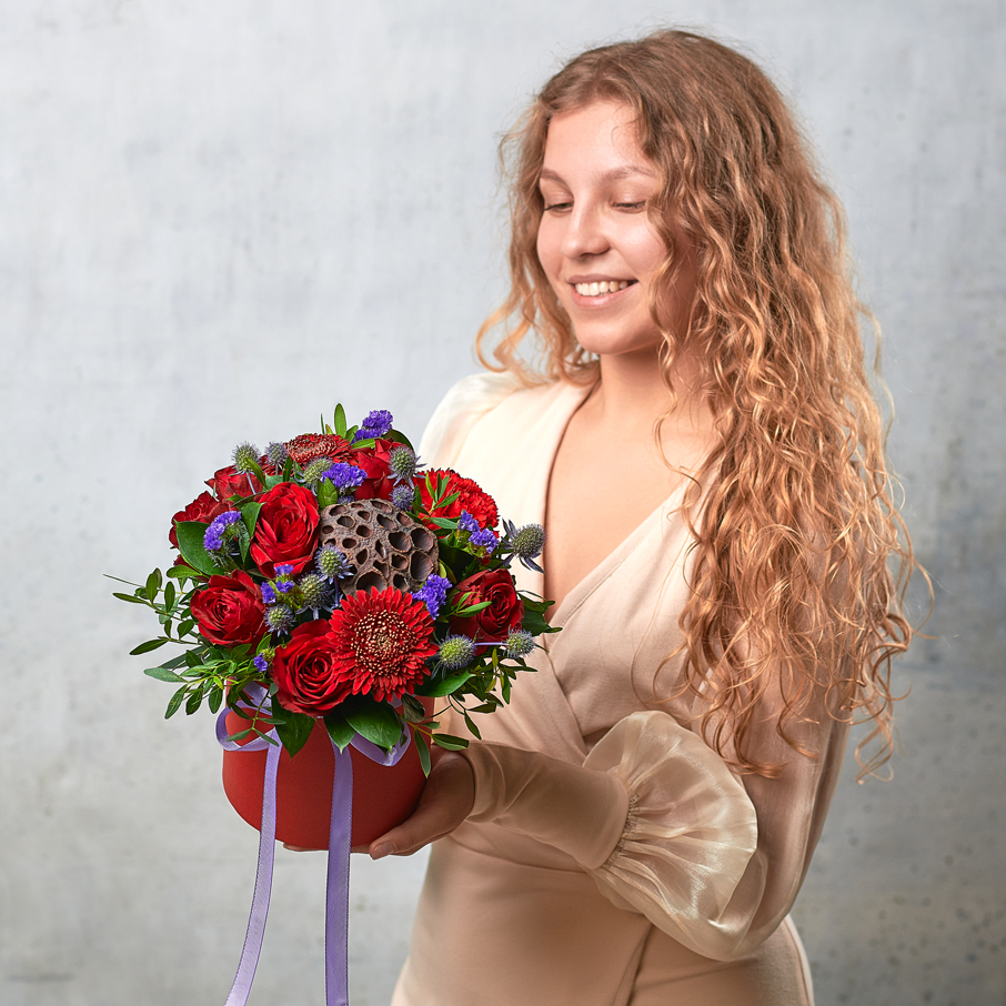 Красный - цвет страсти, любви. Цветочное танго для ваших любимых с изящной деталью из коробочки лотоса. Возможны небольшие изменения элементов. Общий вид и композиция букета будет сохранена.