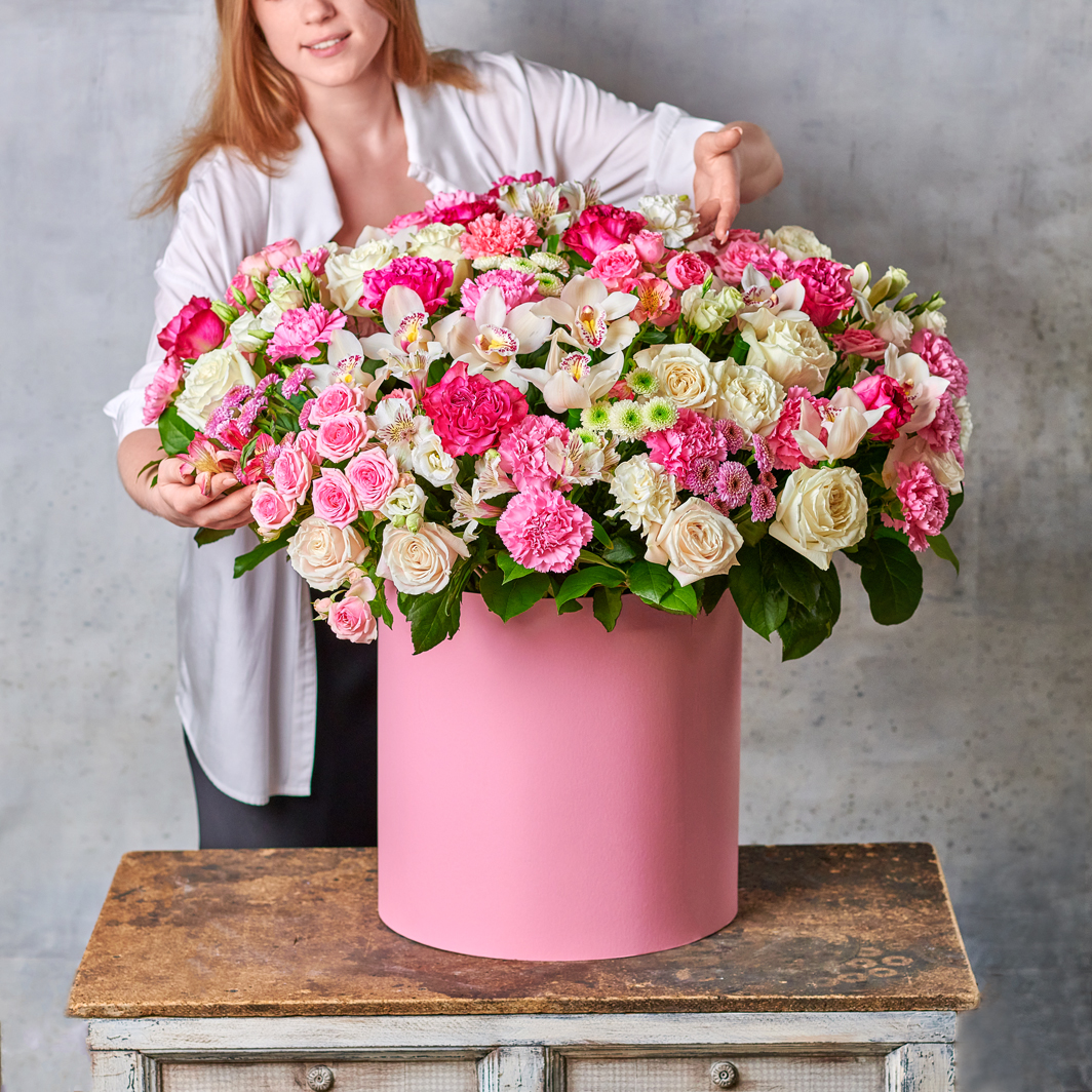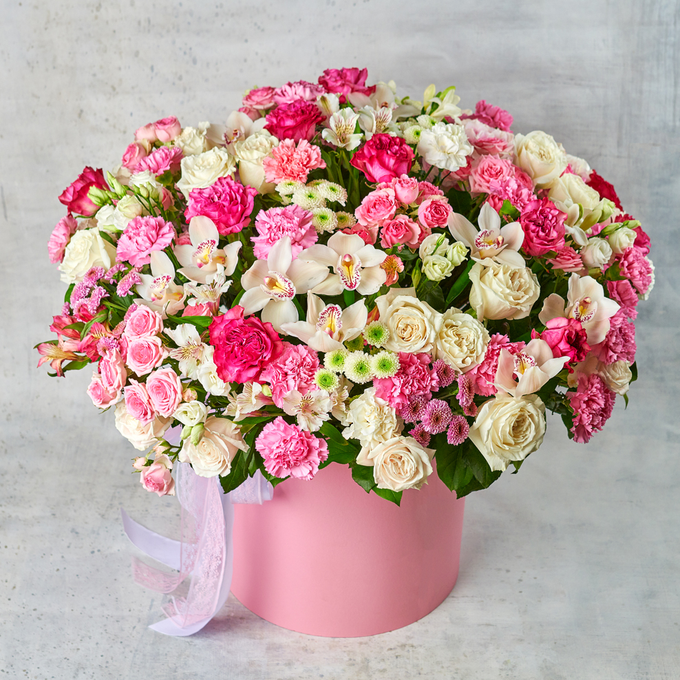 Невообразимое сочетание текстур и полутонов в классическом исполнении. Для ценителей эффектных и больших букетов, которые точно придутся по вкусу каждой, ведь состав такой композиции пышет разнообразием. Подарите по-настоящему королевский праздник с целой комнатой цветов. Обратите внимание, в составе присутствует сезонный цветок, который может быть заменен исходя из наличия товара. Возможны небольшие изменения элементов. Общий вид и композиция букета будет сохранена.