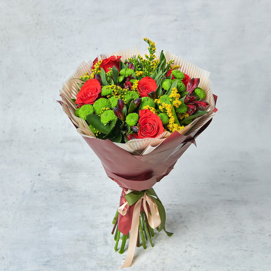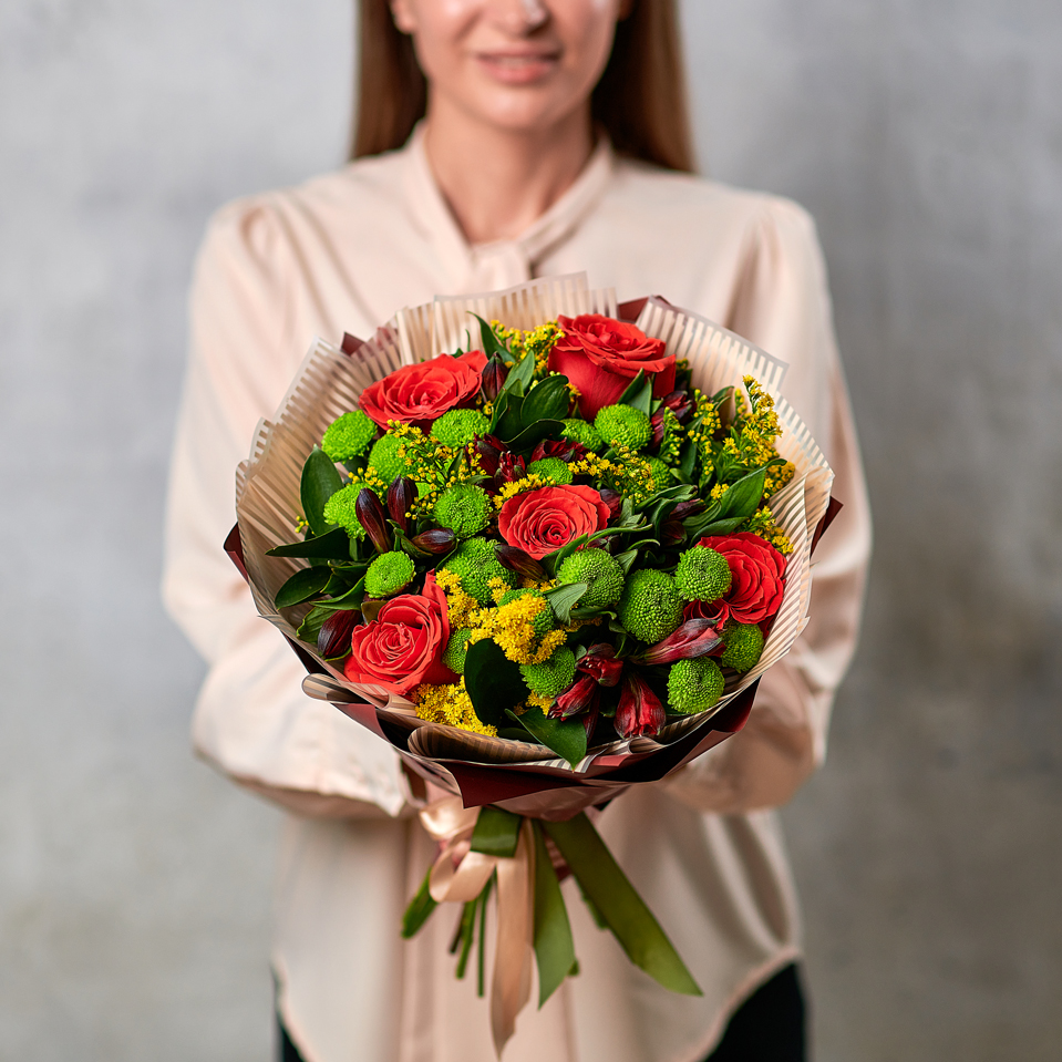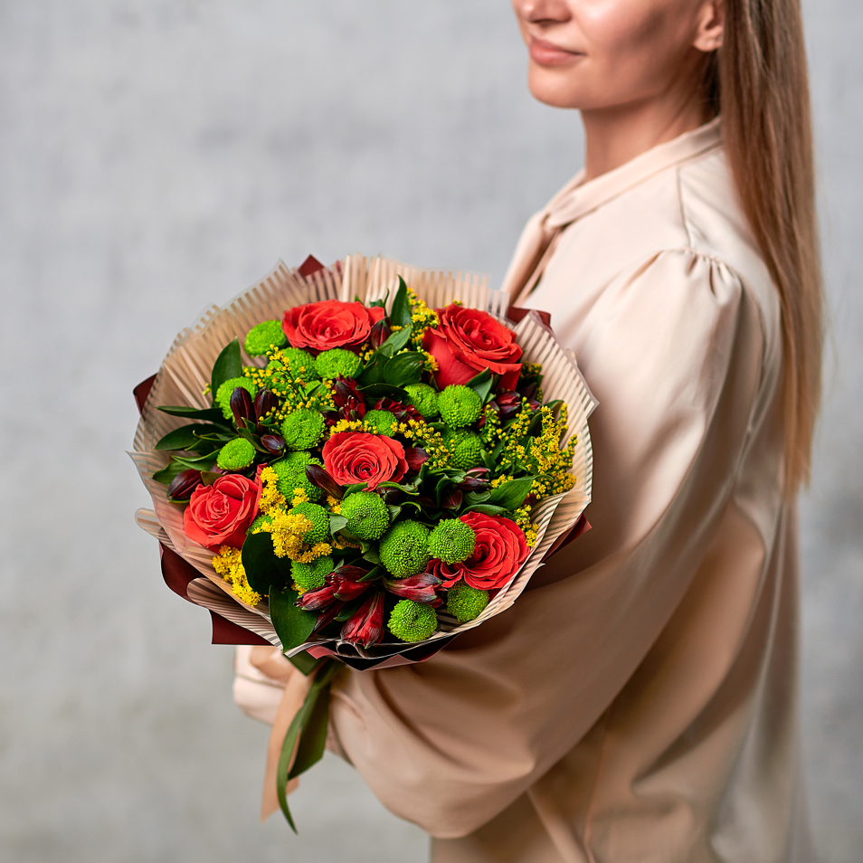 Букет из контрастных праздничных оттенков точно оставит след в памяти, ароматные розы заставят улыбнуться, а упаковка в натуральных оттенках придаст баланс вашей цветочной истории. Возможны небольшие изменения элементов. Общий вид и композиция букета будет сохранена.