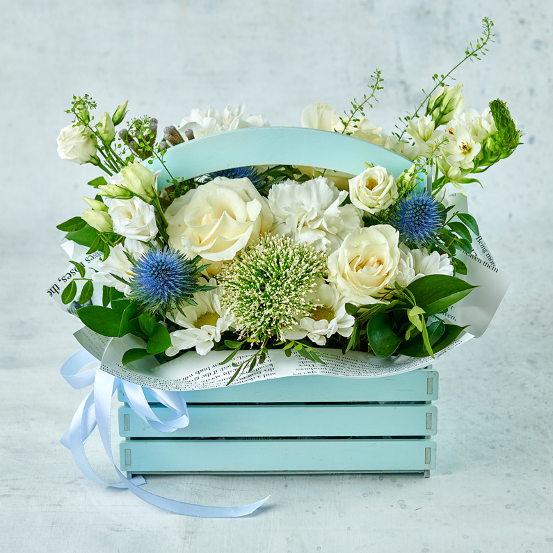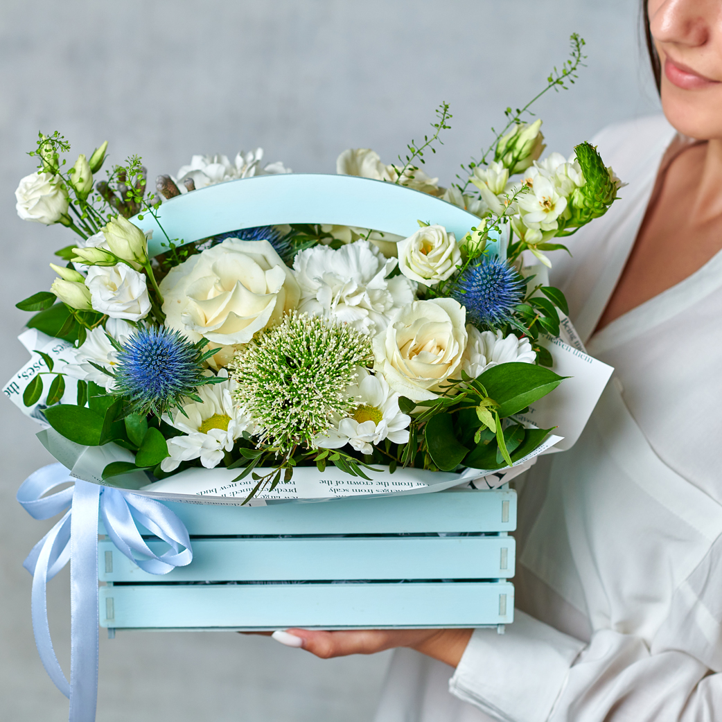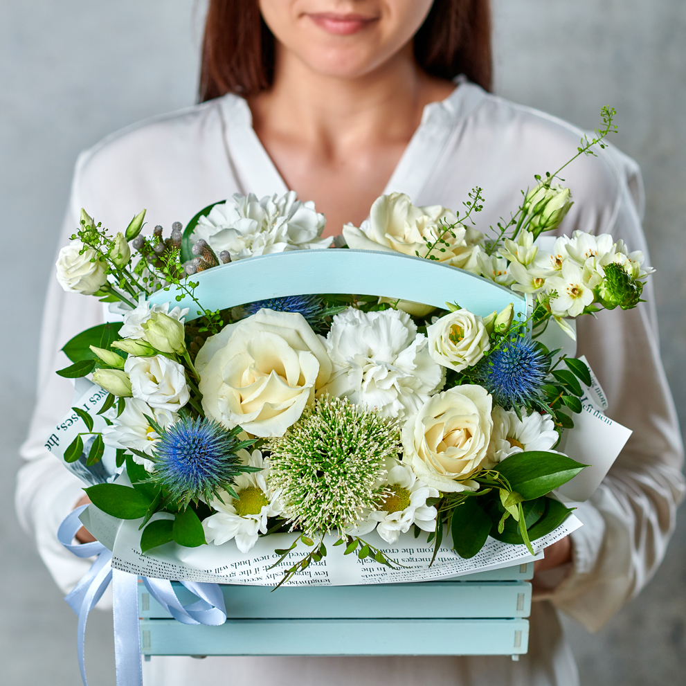 Ищные линии, нежная зелень и белоснежные лепестки. Торжественно и неповторимо, как первые объятия под голубым небом. Возможны небольшие изменения элементов. Общий вид и композиция букета будет сохранена.